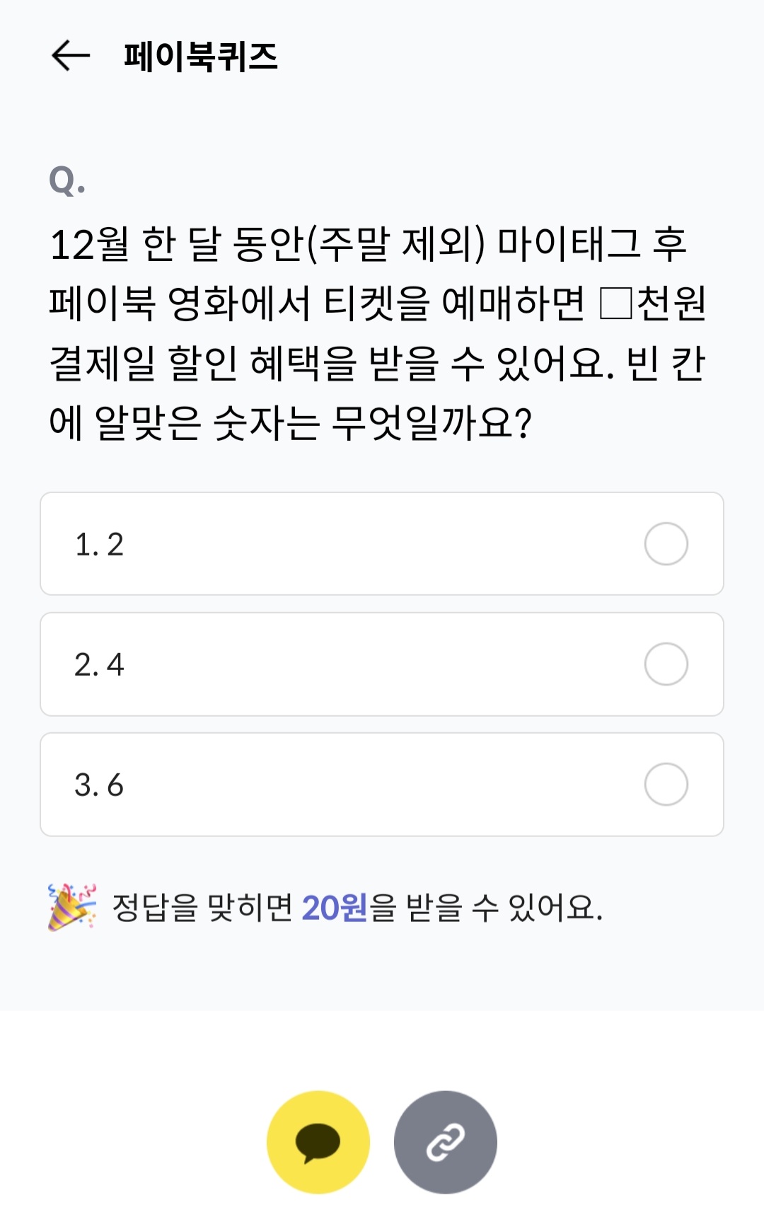 Q.12월 한달동안(주말제외) 마이태그 후 페이북 영화에서 티켓을 예매하면 □천원 결제일 할인 혜택을 받을수있어요.